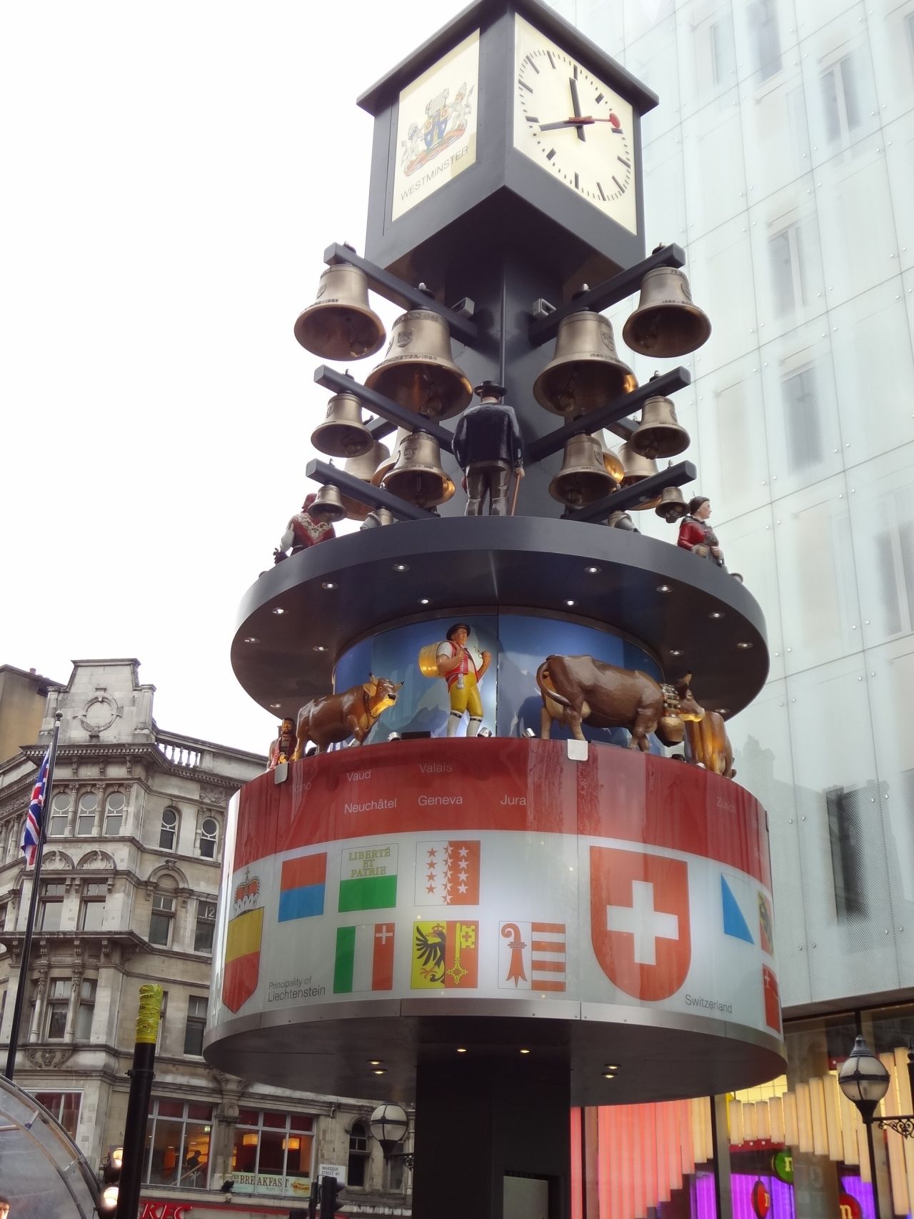 Die 10 m hohe Struktur zeigt 11 bewegliche Schweizer Figuren vor einer traditionellen Schweizer Alpenkulisse, Bilder der 26 Schweizer Kantone, 27 Glocken, vier Glöckner und zwei Schweizer Eisenbahnuhren an der Spitze. Das Glockenspiel läutet täglich zur Mittagszeit, an Wochentagen von 17.00 bis 20.00 Uhr und an Wochenenden von 14.00 bis 20.00 Uhr.