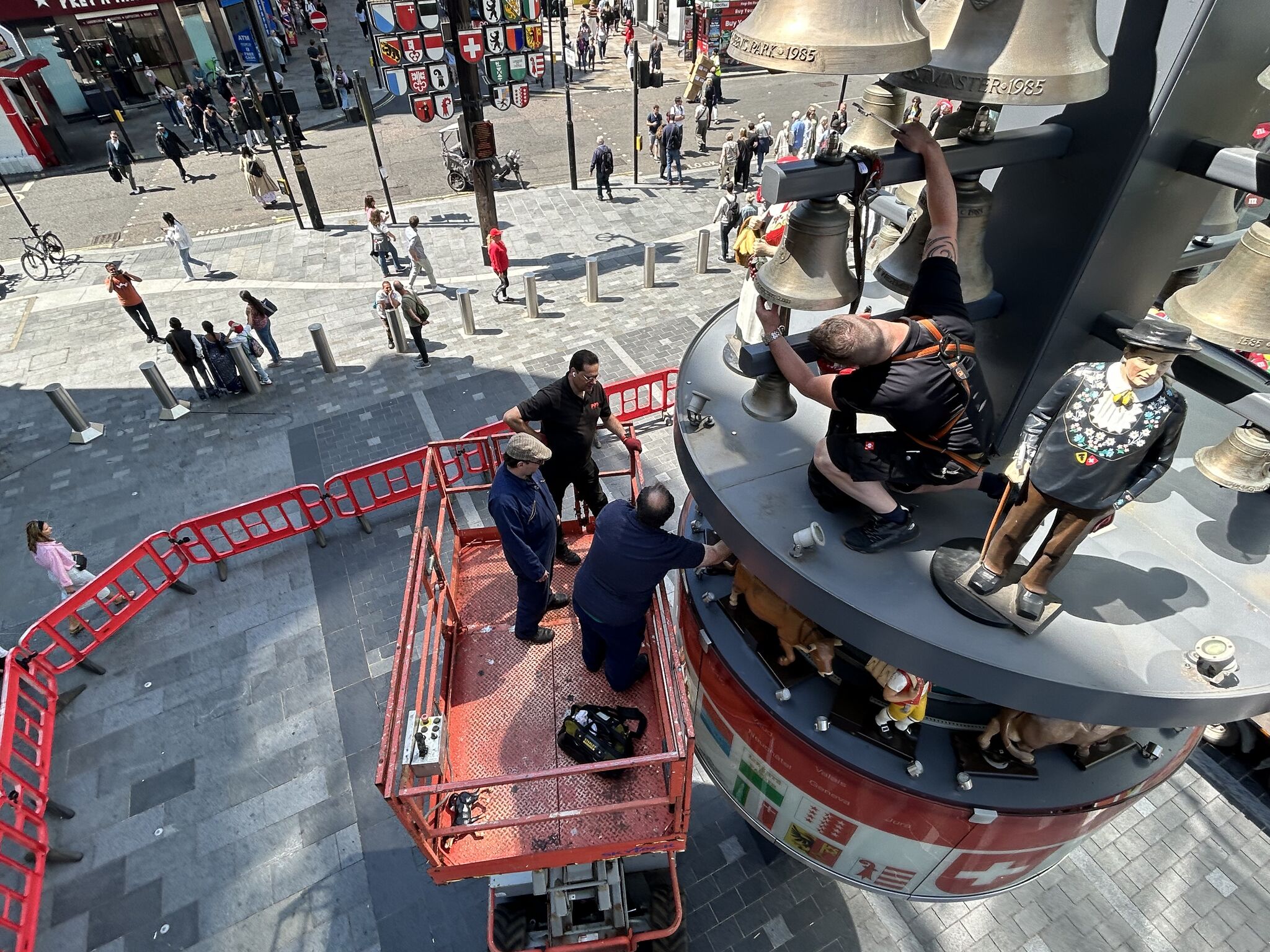 Aber nicht, um Ferien zu geniessen, sondern um das Glockenspiel von Switzerland Tourism instand zu stellen.